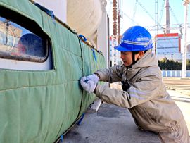 全員加班為變電站設(shè)備做防凍保溫,為網(wǎng)控變電站的關(guān)鍵開關(guān)設(shè)備“穿”上定制保溫棉衣;另一路由經(jīng)驗(yàn)豐富的老員工牽頭,對(duì)空壓機(jī)管路及附屬設(shè)施加裝保溫層,”班長(zhǎng)趙詩宇一邊指導(dǎo)年輕員工郝巖包裹開關(guān)接線口。